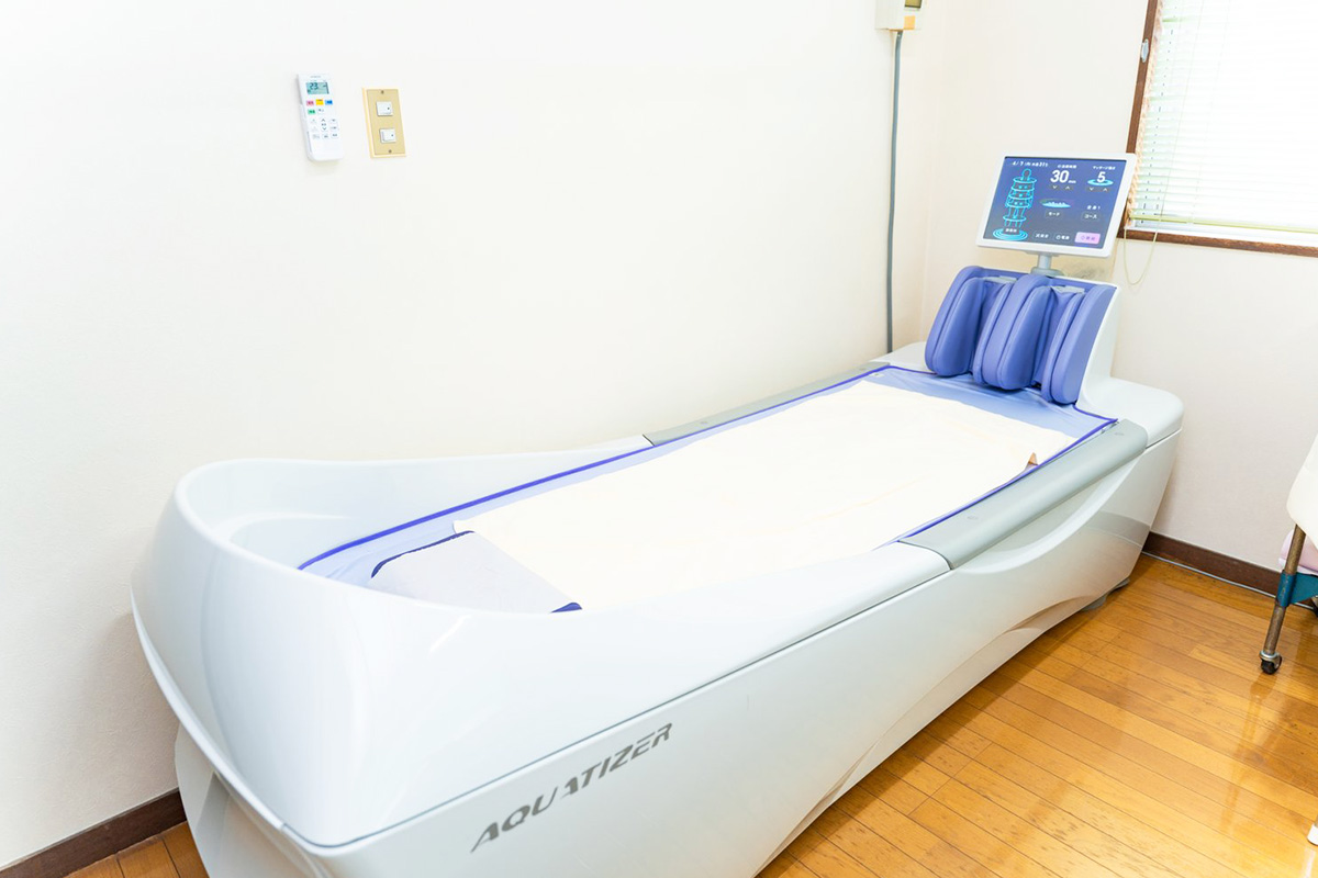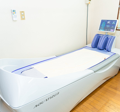 水の入ったベッドの上に寝ていただき、強い渦巻、サイクロン水流による水圧振動刺激がくまなく全身をマッサージできるものとなっています。患者様身長に合わせて、全身・頚部・肩部・背部・腰部・下肢の6つの治療部位にそれぞれマッサージを行う事ができ、血行促進などのマッサージ作用に加え、リラクゼーションが期待できます。